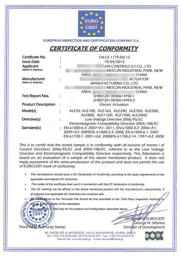 希臘CE認證證書(電動執行...