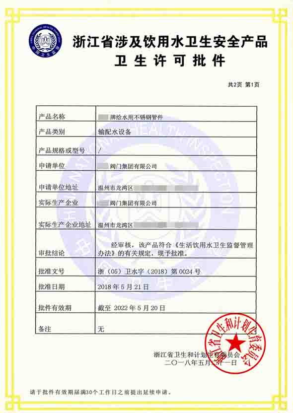 衛生許可批件證書